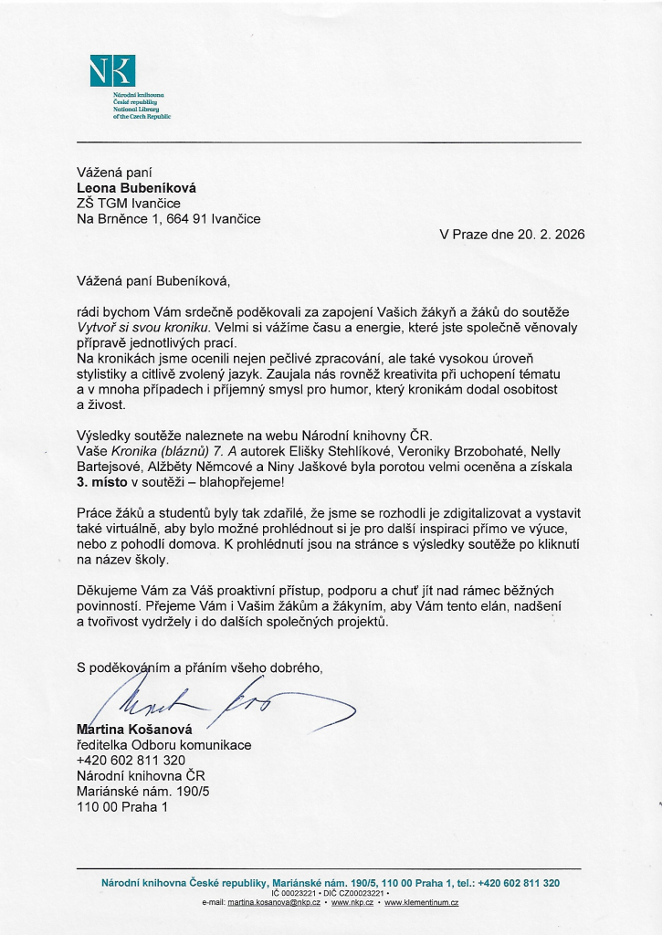 Od Národní knihovny jsme dostali navíc moc pěkný dopis s poděkováním a zhodnocením soutěže.