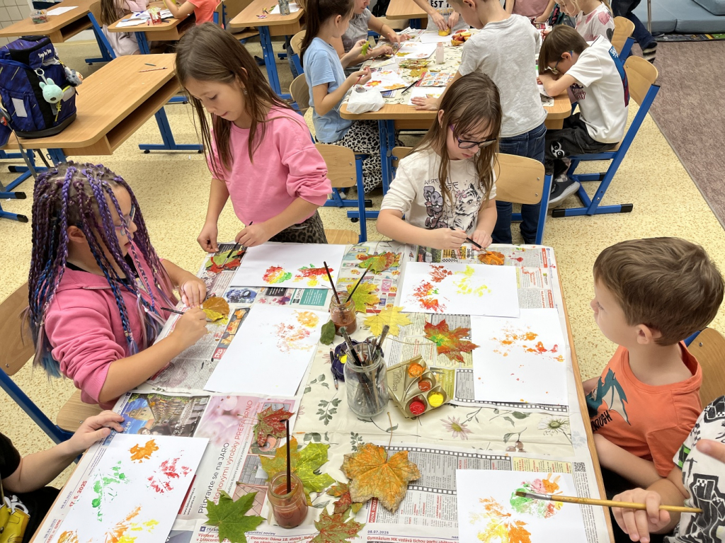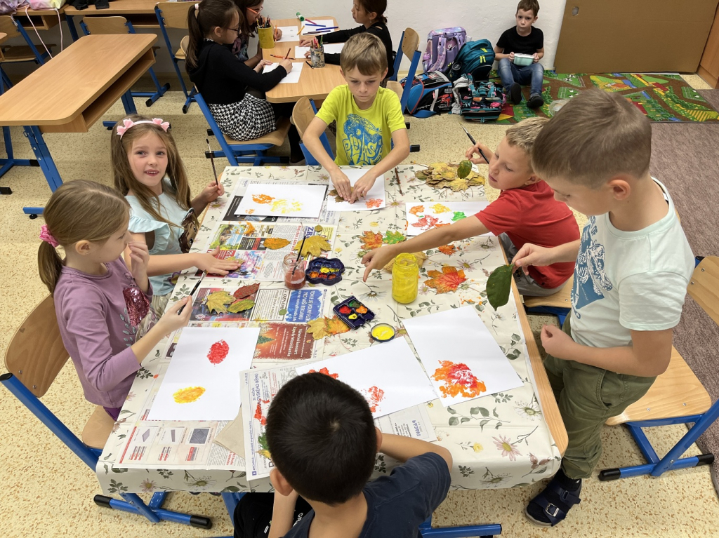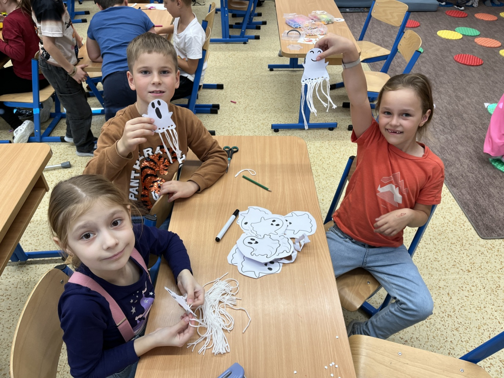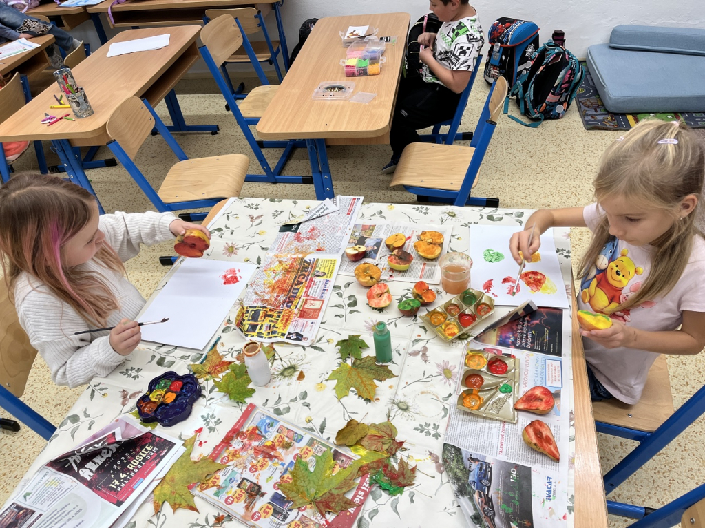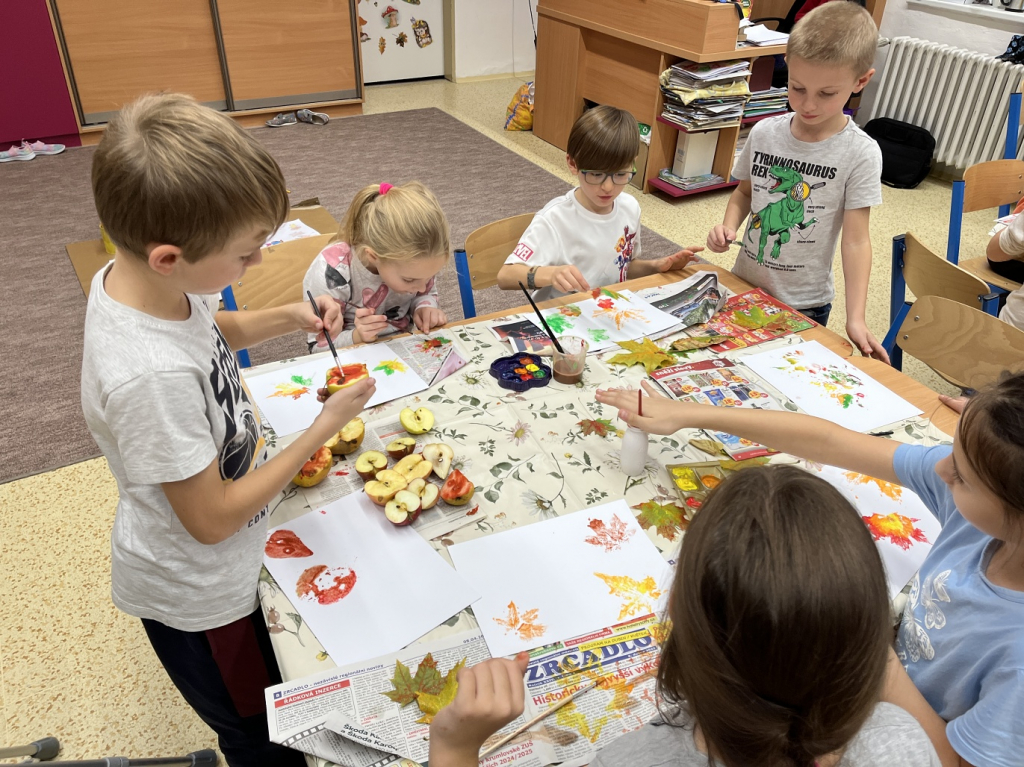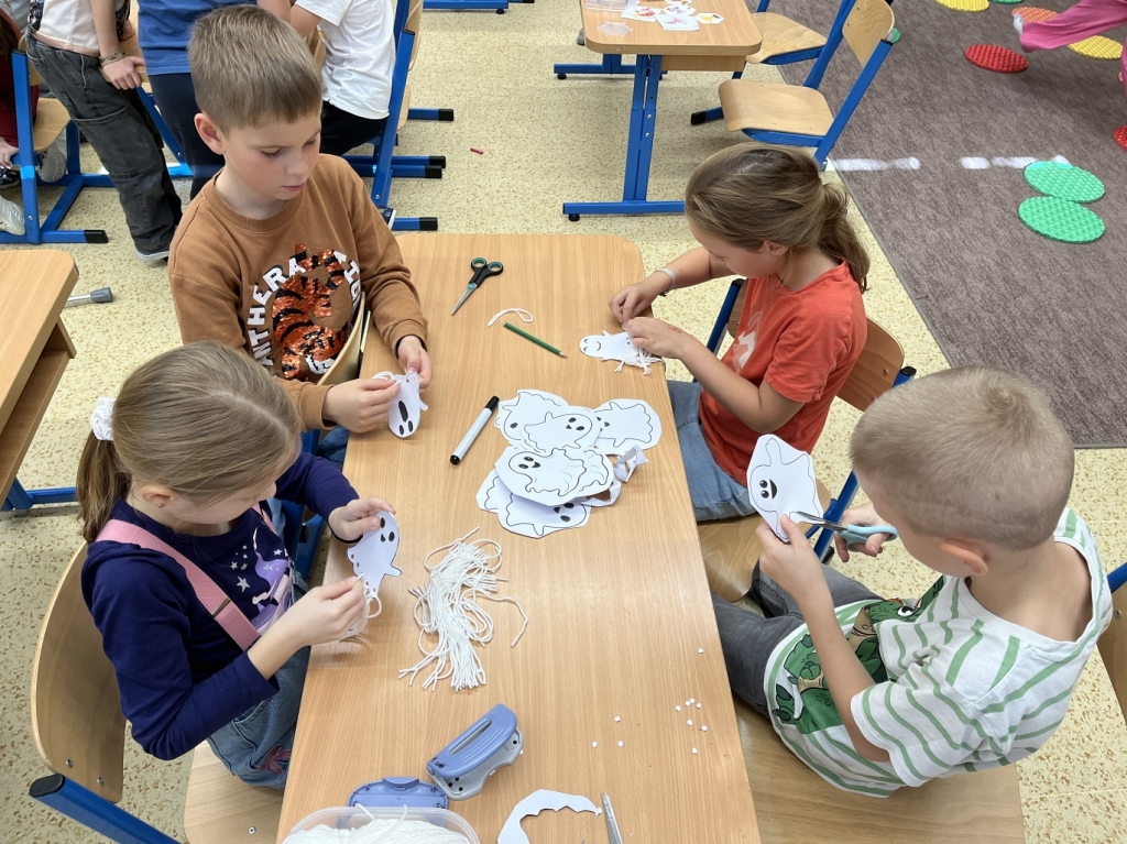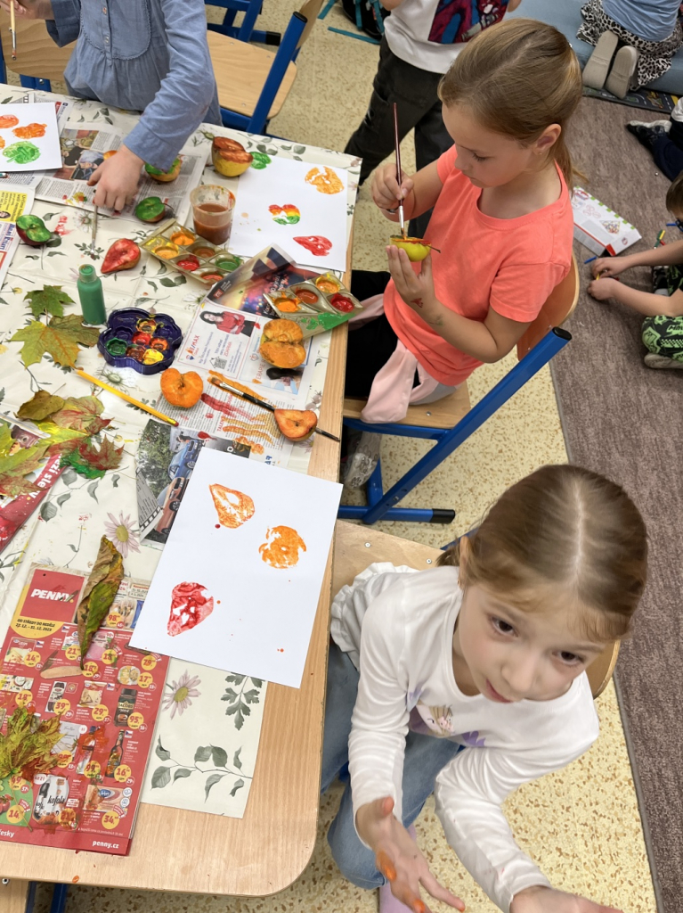 Výtvarné aktivity nás provázely celým měsícem. Vytvářeli jsme otisky listů, jablíček i hrušek na papír a vznikaly tak krásné a barevné obrázky, které nyní zdobí naši družinu. V rámci příprav na Halloween jsme vyráběli veselé i strašidelné duchy a další tematické dekorace, které navodily tu správnou podzimní atmosféru.
