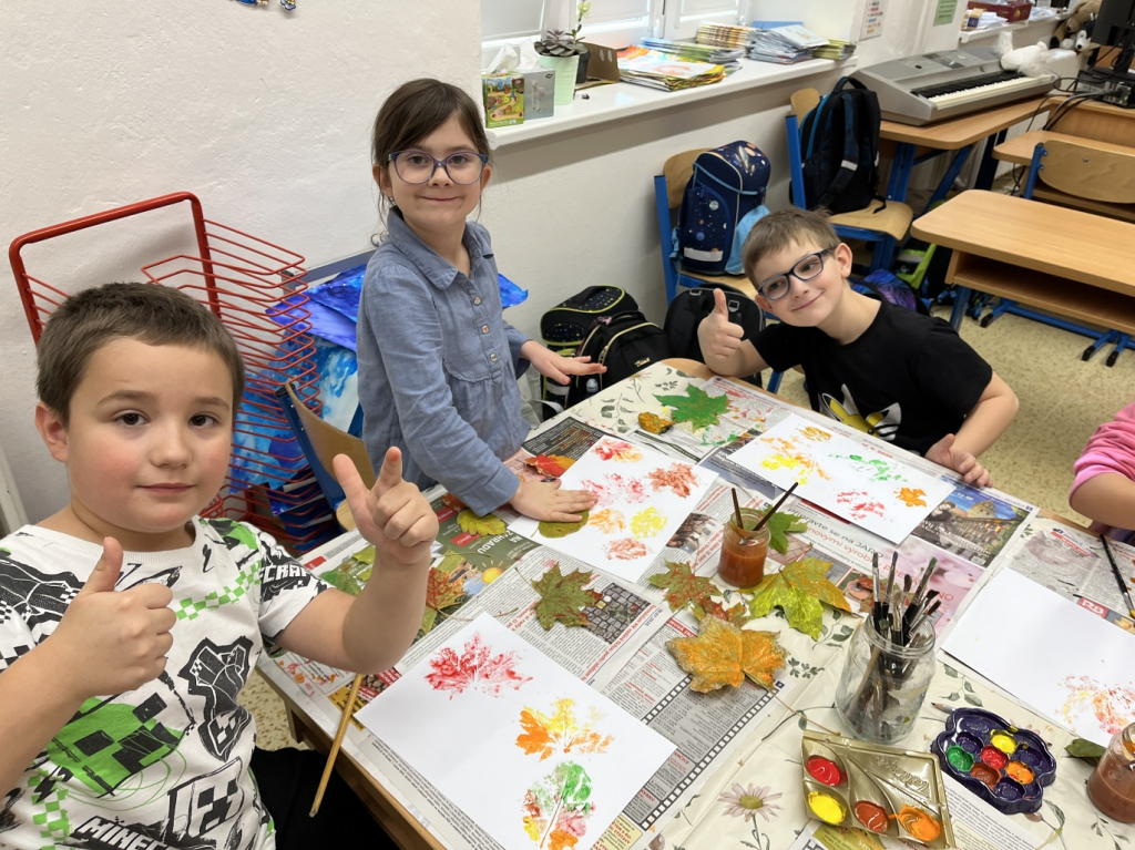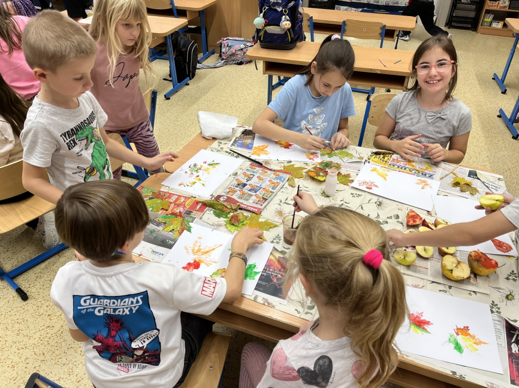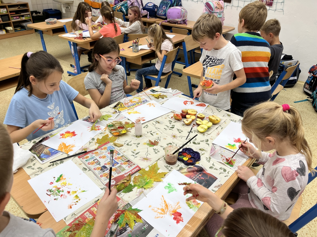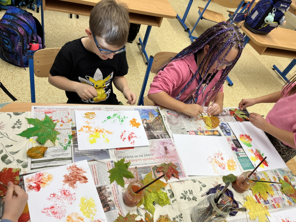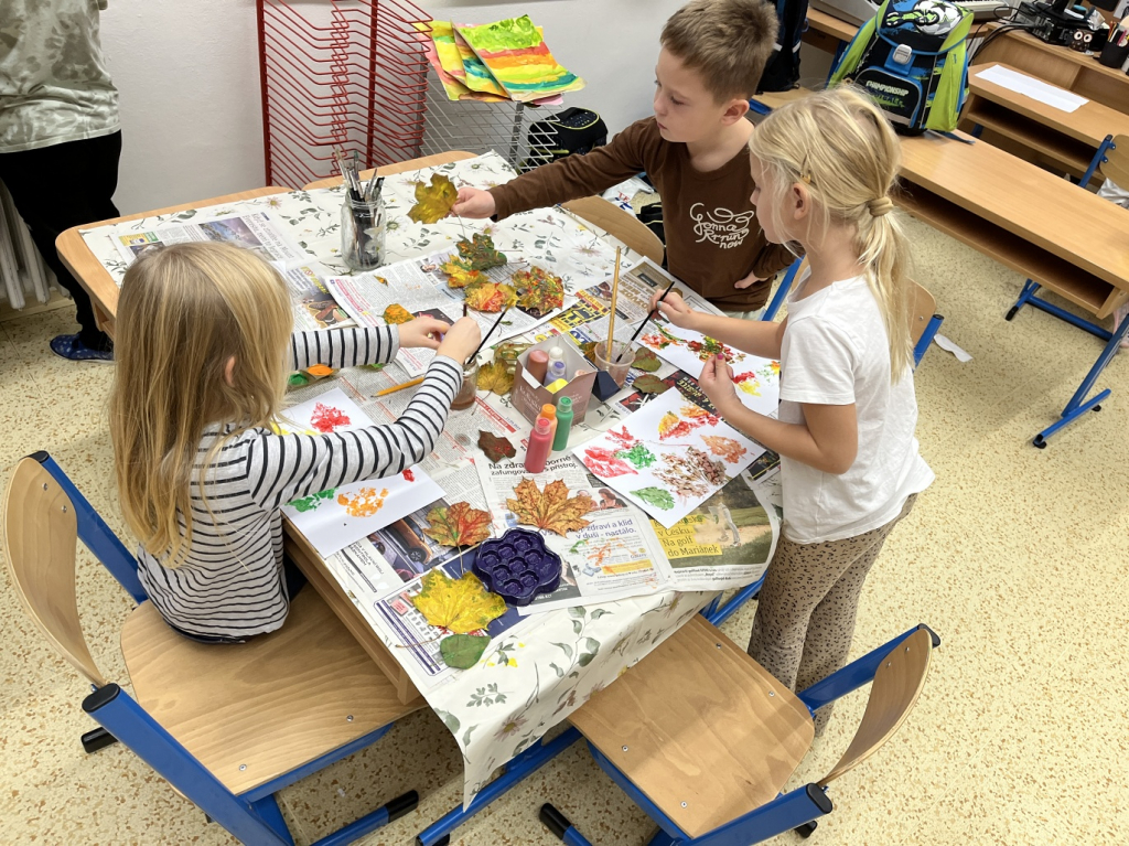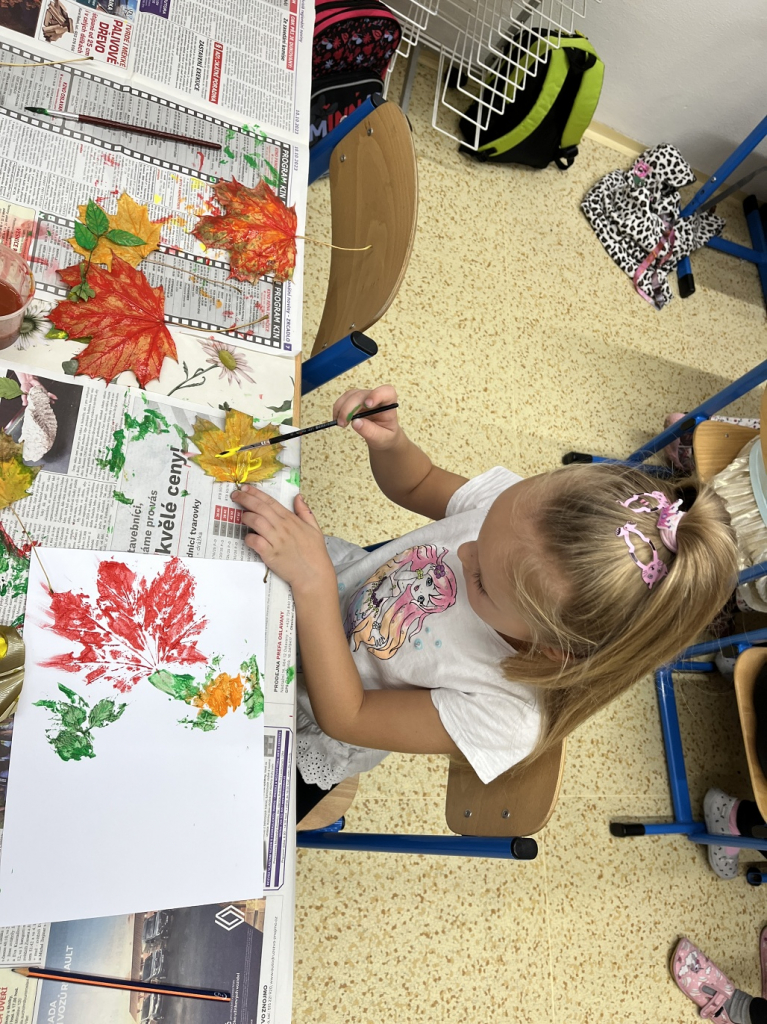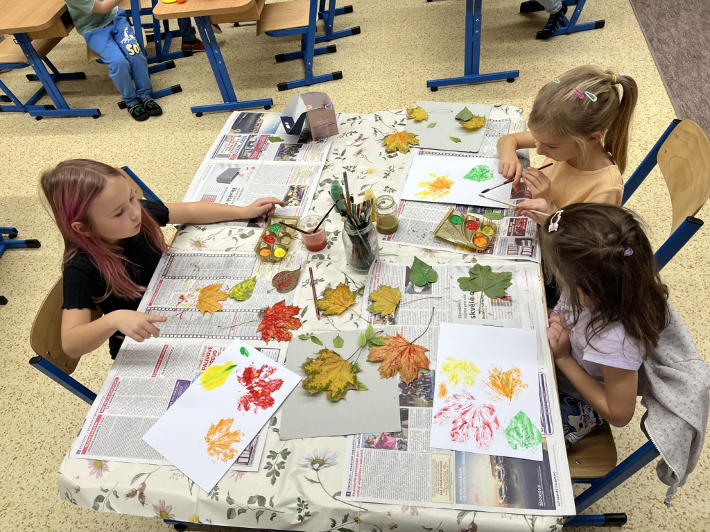 Výtvarné aktivity nás provázely celým měsícem. Vytvářeli jsme otisky listů, jablíček i hrušek na papír a vznikaly tak krásné a barevné obrázky, které nyní zdobí naši družinu. V rámci příprav na Halloween jsme vyráběli veselé i strašidelné duchy a další tematické dekorace, které navodily tu správnou podzimní atmosféru.