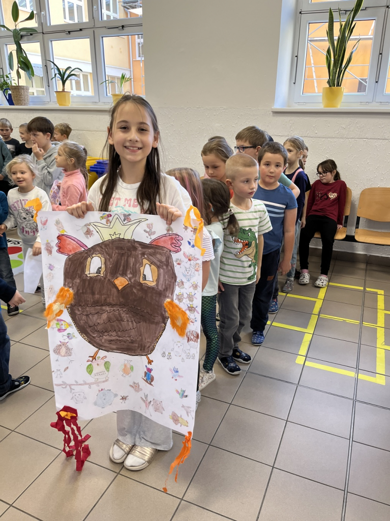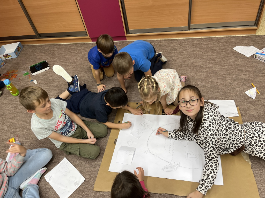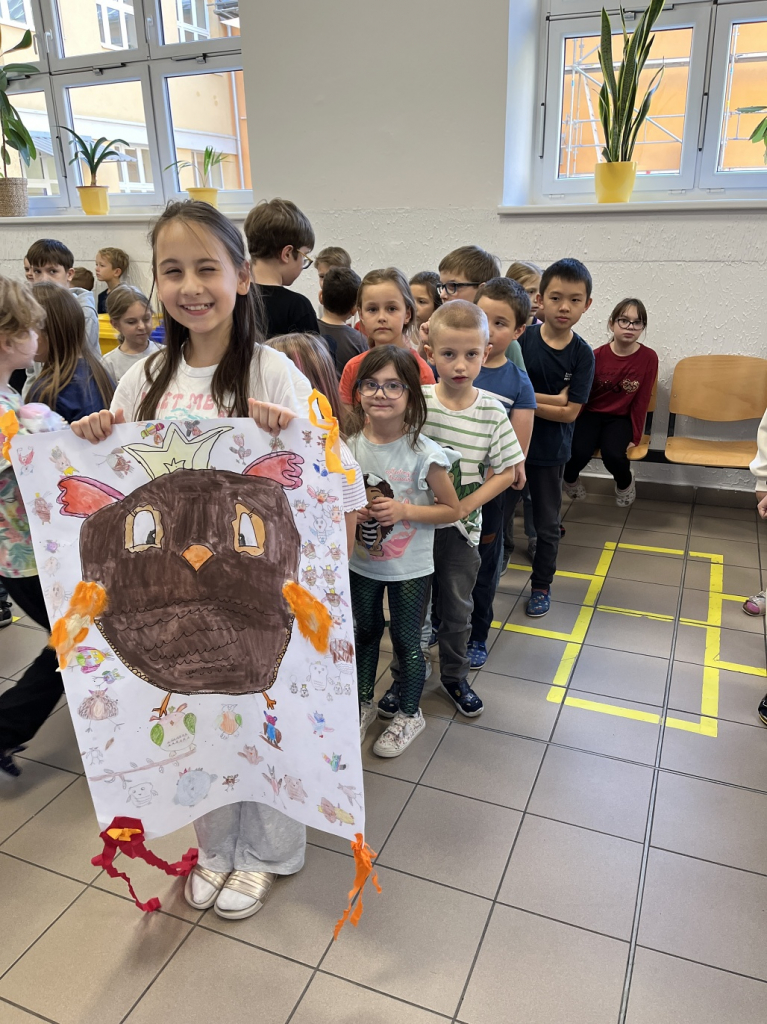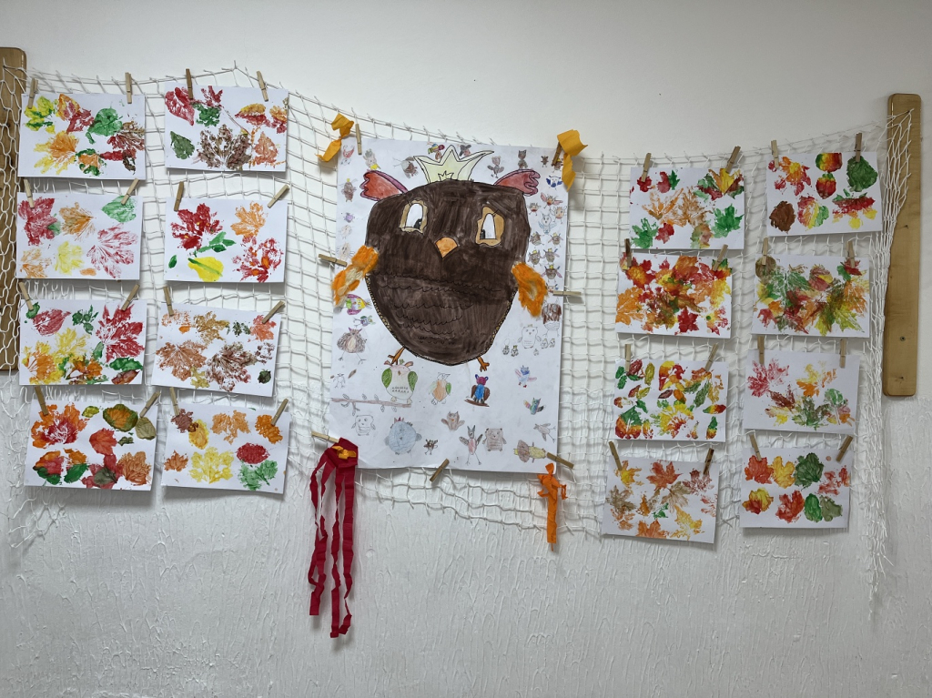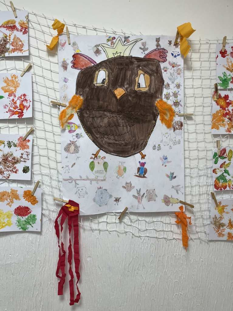 Jedním z největších projektů byla společná výroba velkého draka, který symbolizuje naši družinu. Každé dítě na něj nakreslilo svou malou sovičku – symbol moudrosti a přátelství. Uprostřed draka se pak vyjímá velká sova, která nás všechny spojuje. Tento krásný výtvor nyní zdobí naši nástěnku a připomíná nám, jak jsme jako tým silní, když spolupracujeme.