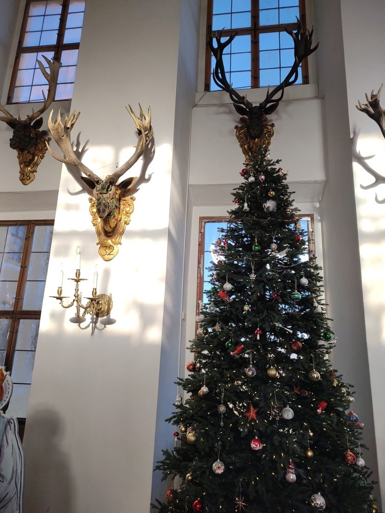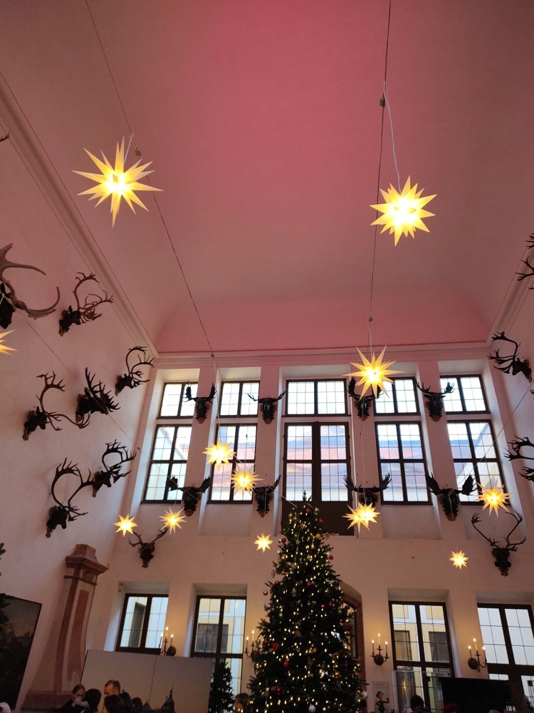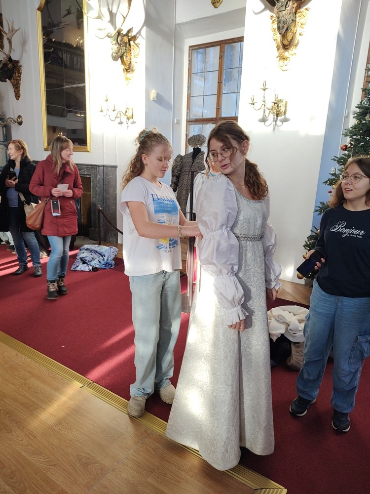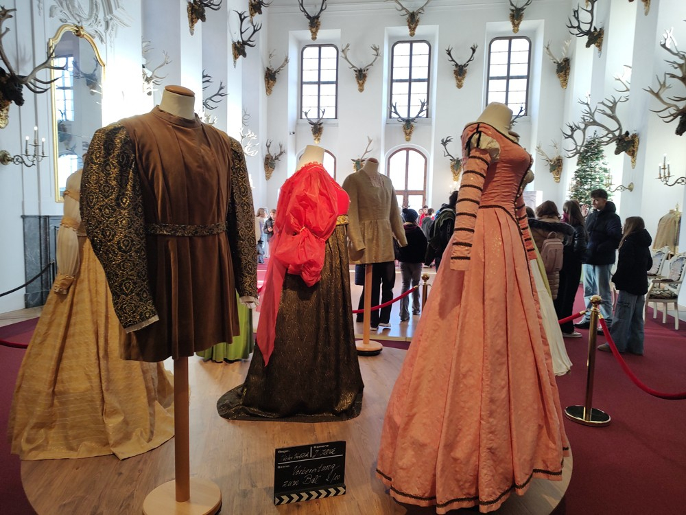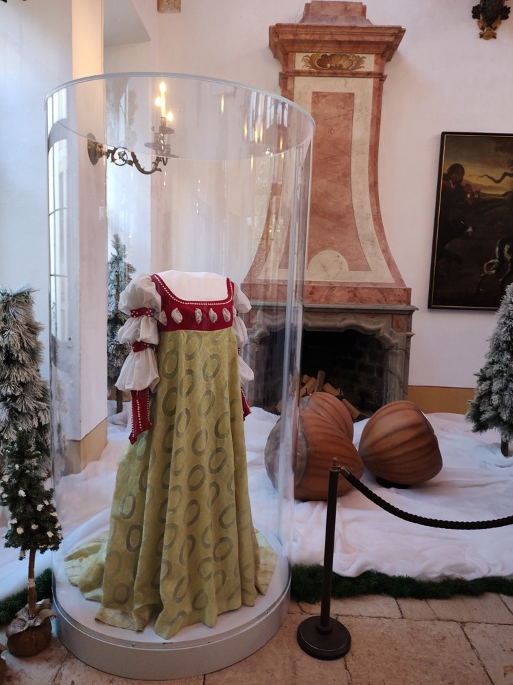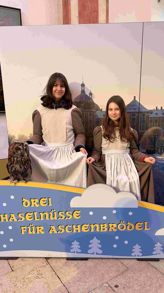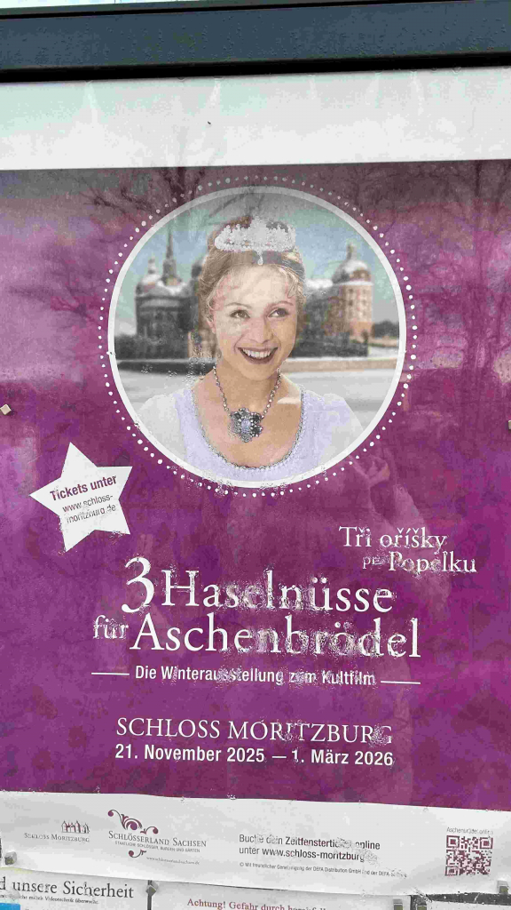 Nejprve nás tedy čekal Moritzburg, v jehož kulisách se natáčela známá česká pohádka Tři oříšky pro Popelku, bez které si dnes už jen málokdo z nás umí Vánoce představit. V interiéru zámku se tradičně koná zimní výstava věnovaná natáčení této pohádky: ve vánočně vyzdobených místnostech jsme mohli vidět postavy a herce z pohádky, kostýmy Theodora Pištěka, jejichž repliky jsme si také mohli vyzkoušet (kdo by nechtěl být aspoň na okamžik princeznou, že?), z interaktivních prvků jsme se dozvěděli o zajímavostech z natáčení, také jsme si mohli zahrát různé hry a získat tři kouzelné oříšky. Na schodech k zámku si zájemci zkusili obout Popelčin střevíček, vyfotili jsme se a pak už jsme zamířili do Drážďan.