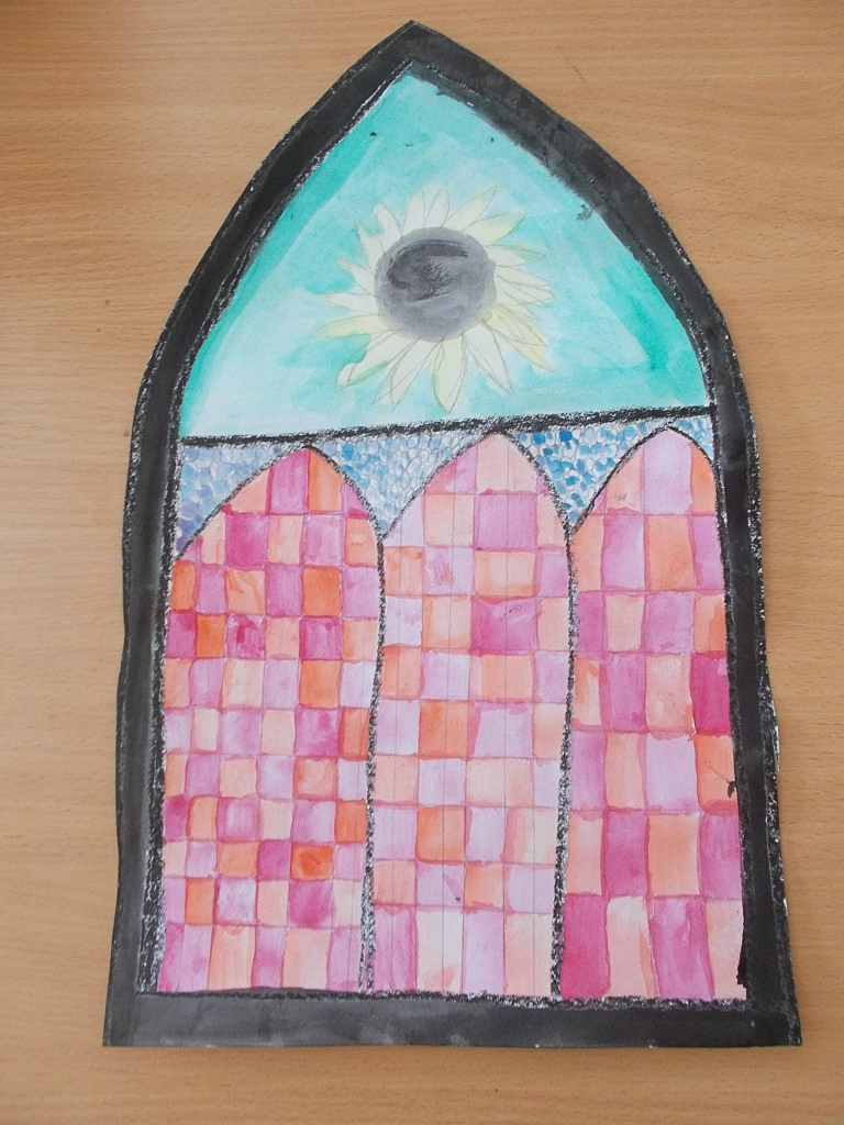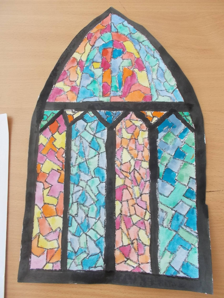 Blíží se doba letních dovolených. Naše kroky budou určitě směřovat i po stopách historie. V hodinách výtvarné výchovy jsme se tentokrát zaměřili na krásu gotických oken – vitráží. Malovali jsme je vodovými barvami. Obrysy tvořily voskové pastely, rámy byly kreslené tuší.