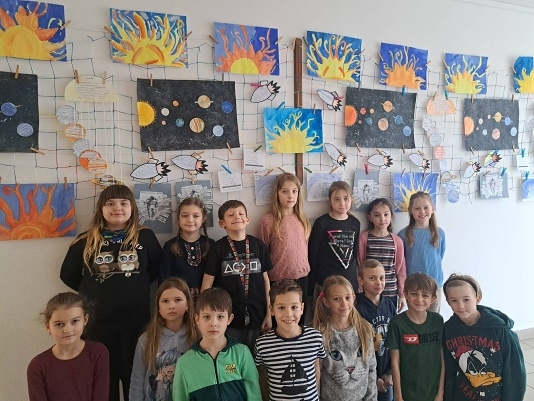 Následovala práce ve skupinách. Nejdříve jsme si povídali o zemské atmosféře. Žáci zjistili, že se dělí ještě na další vrstvy. Každou si vybarvili jiným odstínem modré barvy a přilepili lísteček s názvem. Pokusili se zjistit, v jaké výšce a vrstvě se může pohybovat stroj vytvořený člověkem (letadlo, vesmírná stanice ISS, raketoplán, družice a meteorologický balón). V hodině výtvarné výchovy vybarvovali planety a za pomoci houbičky dotvářeli vesmír.