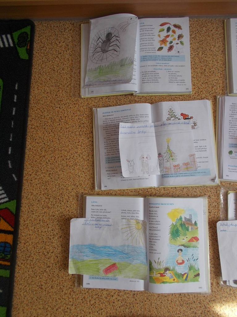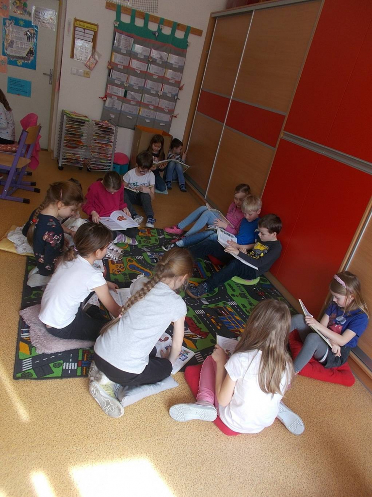 Rádi přecházíme v hodinách čtení z lavic do vybraných míst v prostoru a oddáváme se tichému čtení. Tentokrát žáci pracovali s libovolným úryvkem z čítanky. Zvolili si ho podle svých zálib.