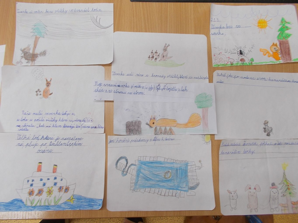 Po skončení času stanoveného pro četbu všichni usedli do lavic a k vybranému úryvku z textu tvořili větu, která jejich vybranou část vystihovala. Namalovali ke své tvorbě i vlastní ilustraci.