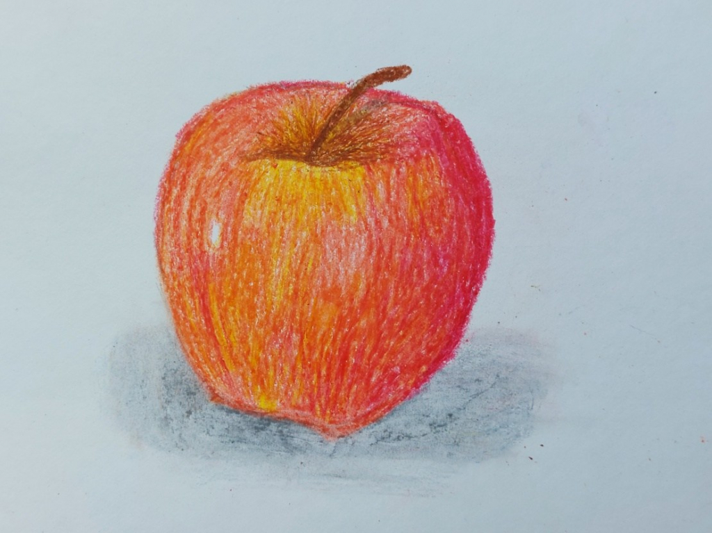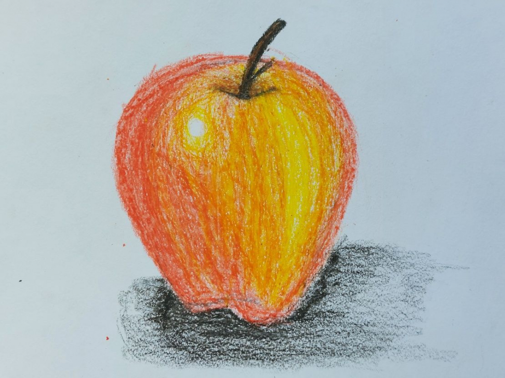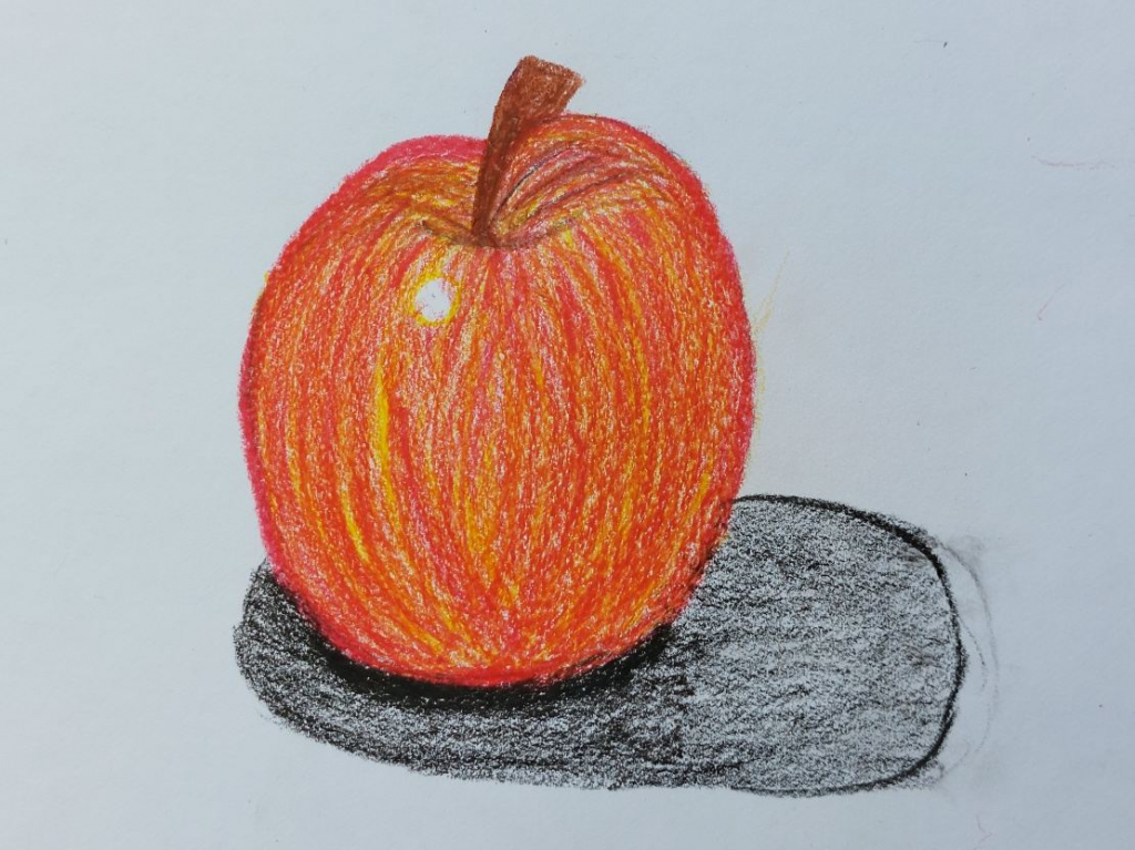 Při kresbě jablka podle reálné předlohy se žáci snažili stínováním a využíváním škály barevných odstínů vytvořit na obrázku dojem trojrozměrnosti. Zde je malá ukázka jejich zdařilé práce.