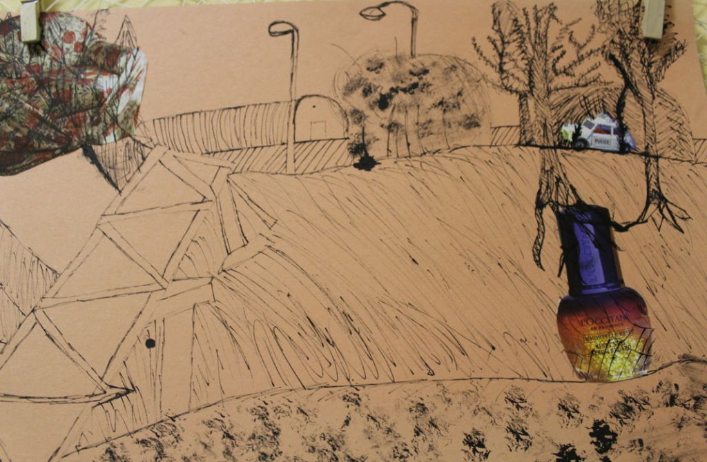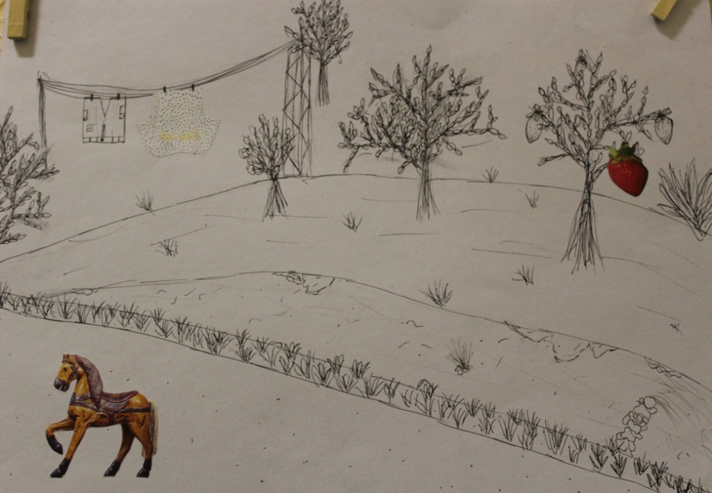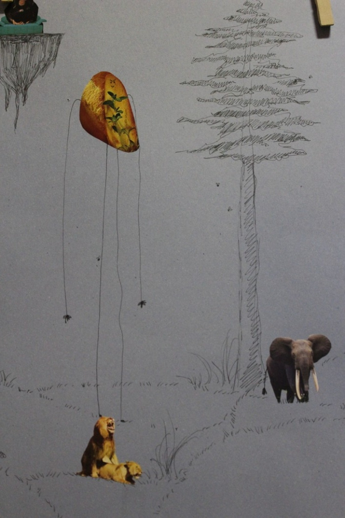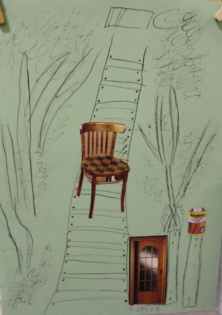 Podobný princip pak žáci přenesli i do výtvarné práce s krajinou, kterou pomocí koláže proměnili v krajinu absurdních setkání, v krajinu ze sna.
