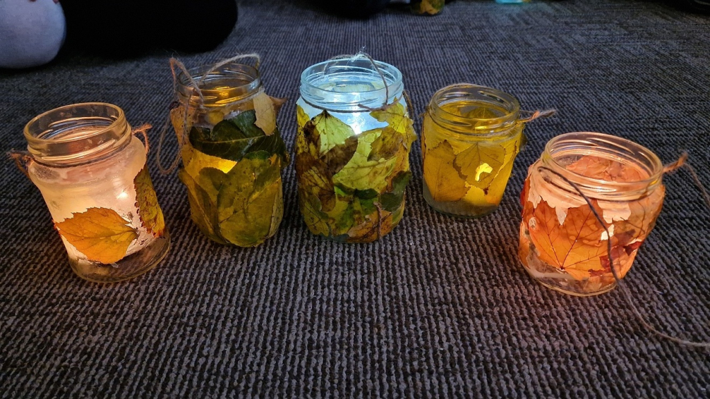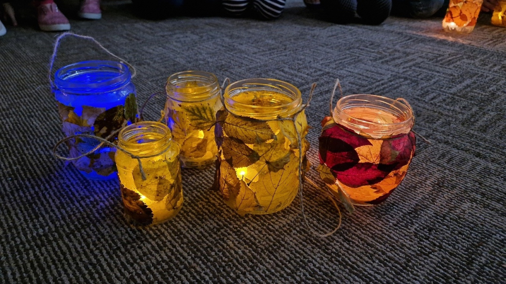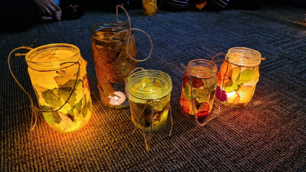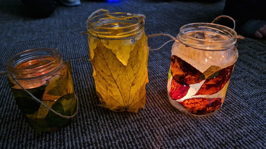 Nasbírané listy jsme lepili na různé sklenice a vložili jsme do nich svíčku. Těšili jsme se na další ráno, kdy je ve třídě ještě pořádná tma. Když jsme pak ráno lucerničky zapálili, měli jsme ten kouzelný pocit, jako když se lidé sesednou kolem ohně. Povídali jsme si o zvycích podzimu a jak se nám daří plnit výzvy na seznamu laskavosti.