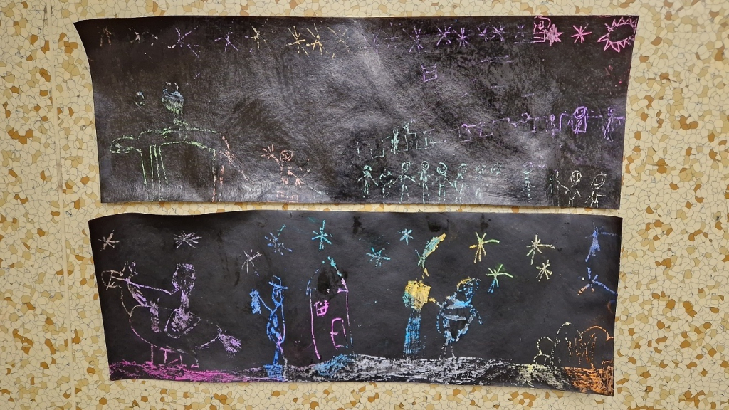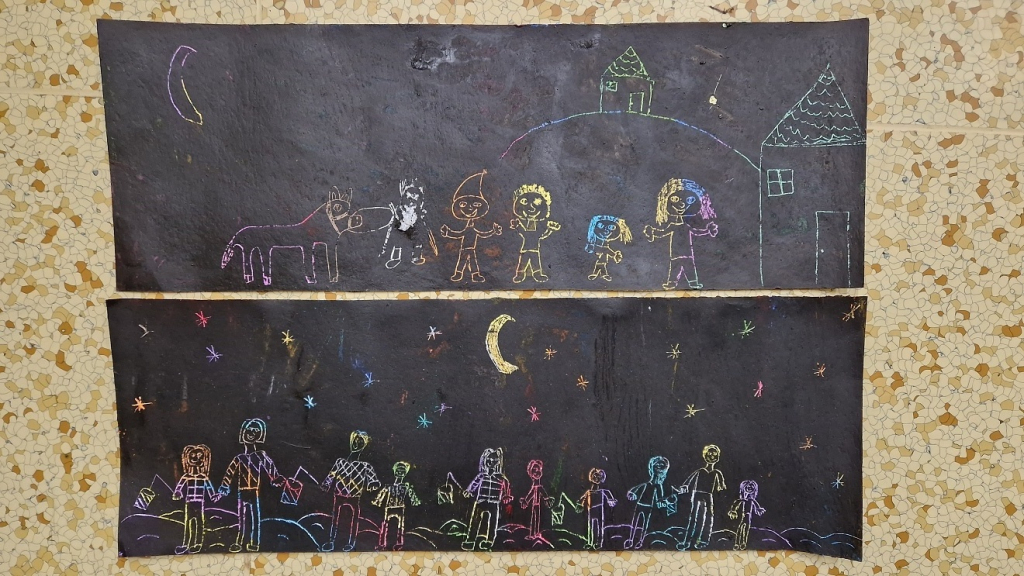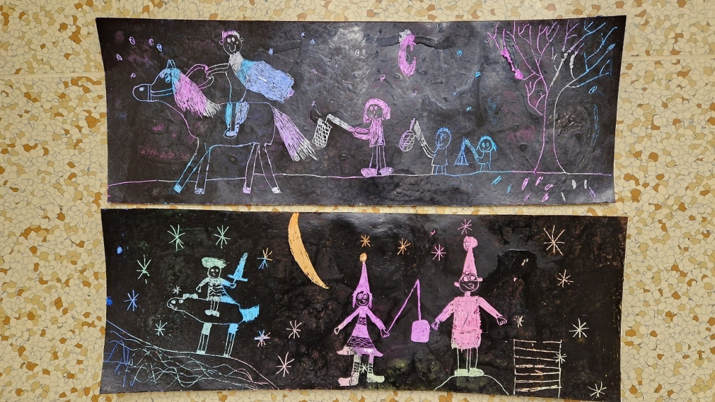 Ve výtvarné výchově jsme si připravovali voskovkami a tuší podklad, do kterého jsme pak vyryli lampionové průvody.