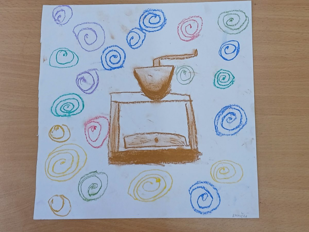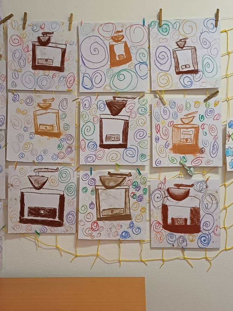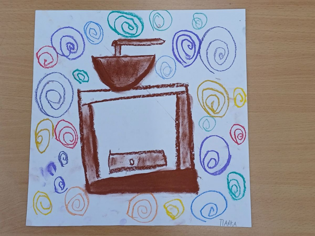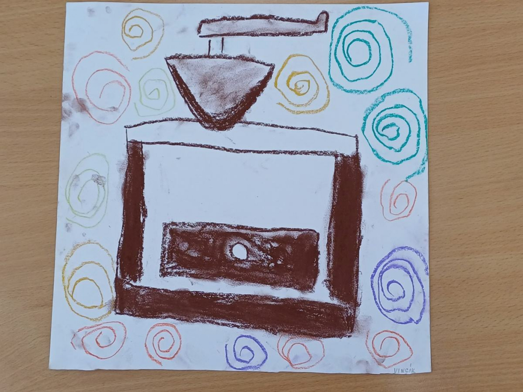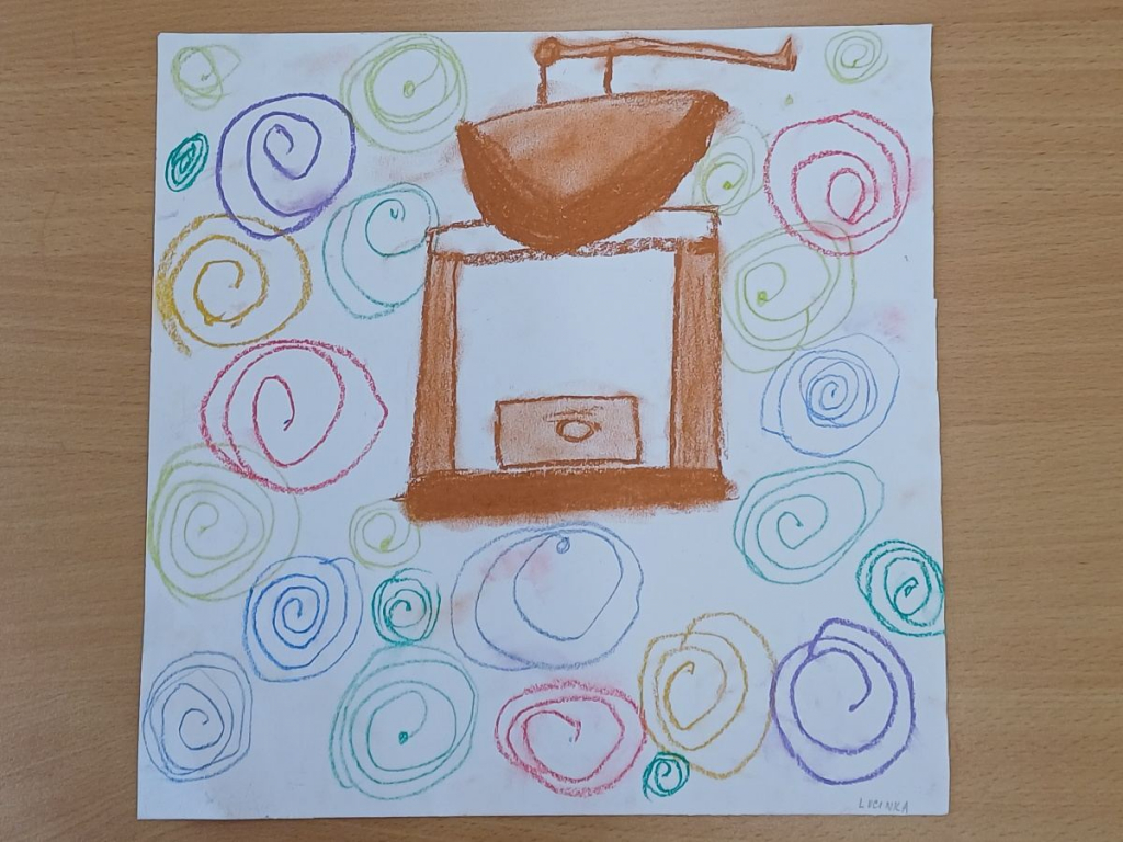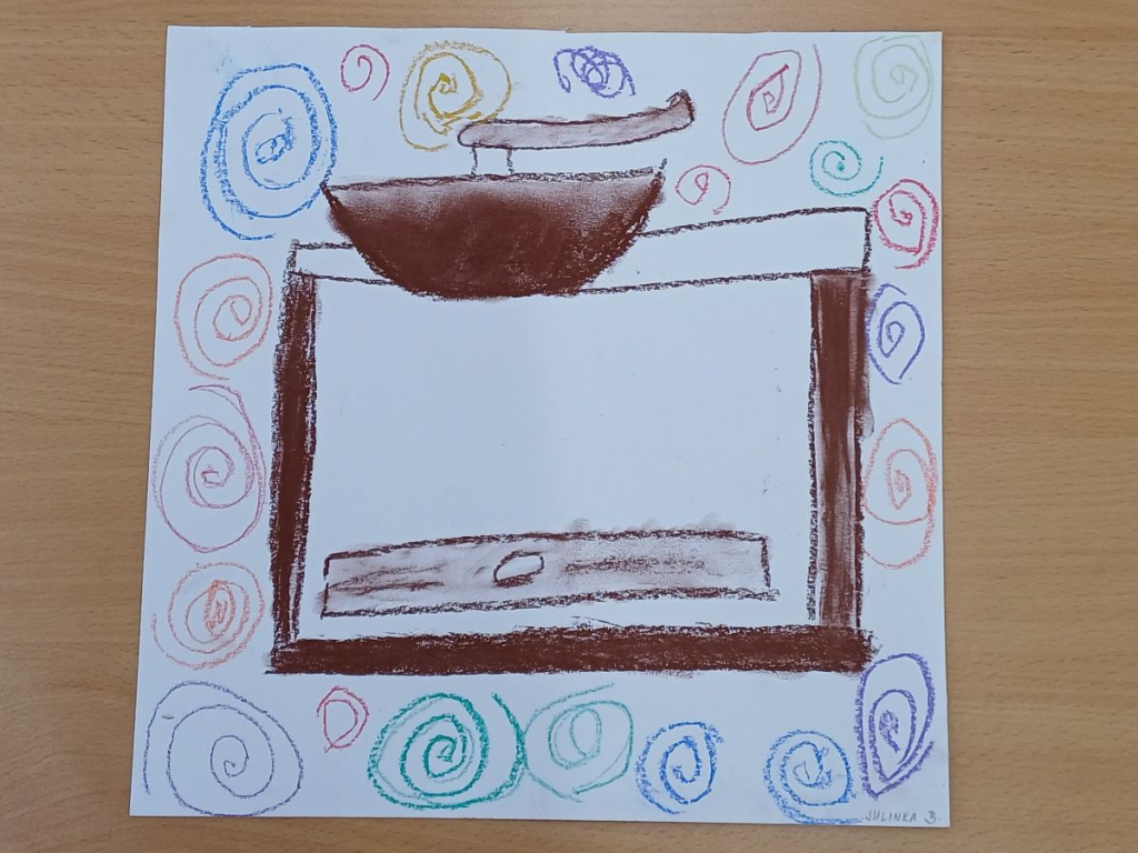 Dnes děti poprvé pracovaly prašnými křídami. Před kresbou jsme si popsali jednotlivé části ručního mlýnku na kávu a seznámili jsme se s jeho mechanismem. K napodobení krouživého pohybu kličky mlýnku děti využily různé barvy. Vznikly velmi pěkné práce, které si můžete u šálku „dobré brazilské kávy“ prohlédnout.