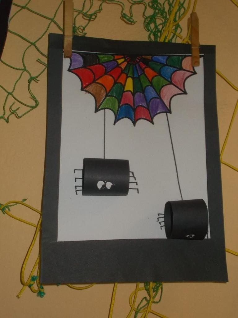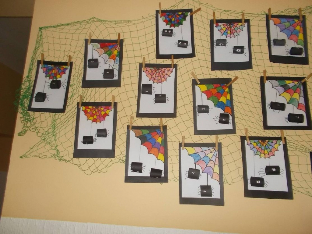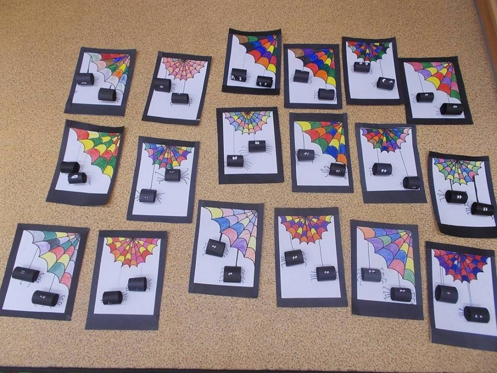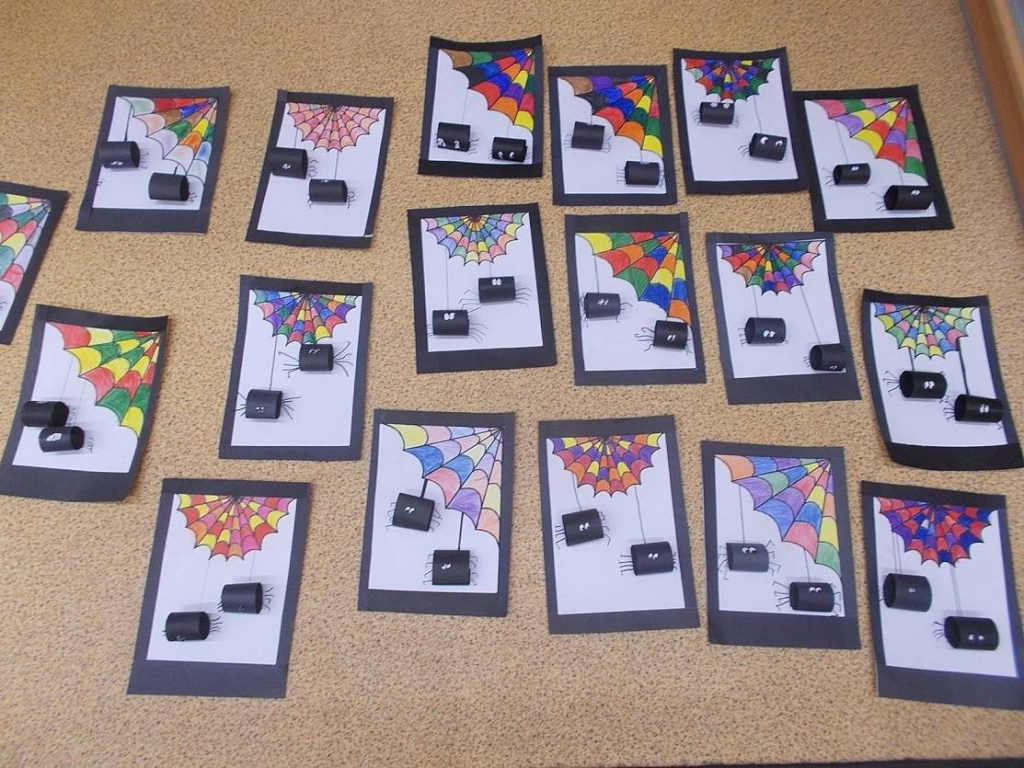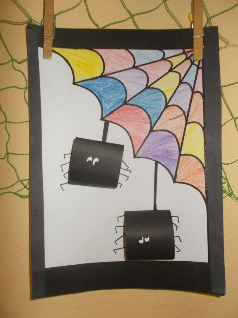 Žáci si  připravenou pavučinu vyzdobili barevnými výsečemi. Z pavučiny spustili 2 pavoučky vyrobené z papíru. Na závěr dokreslili pavoukům správný počet noh. Finální práci vsadili do černého rámu vystřiženého  z papíru.