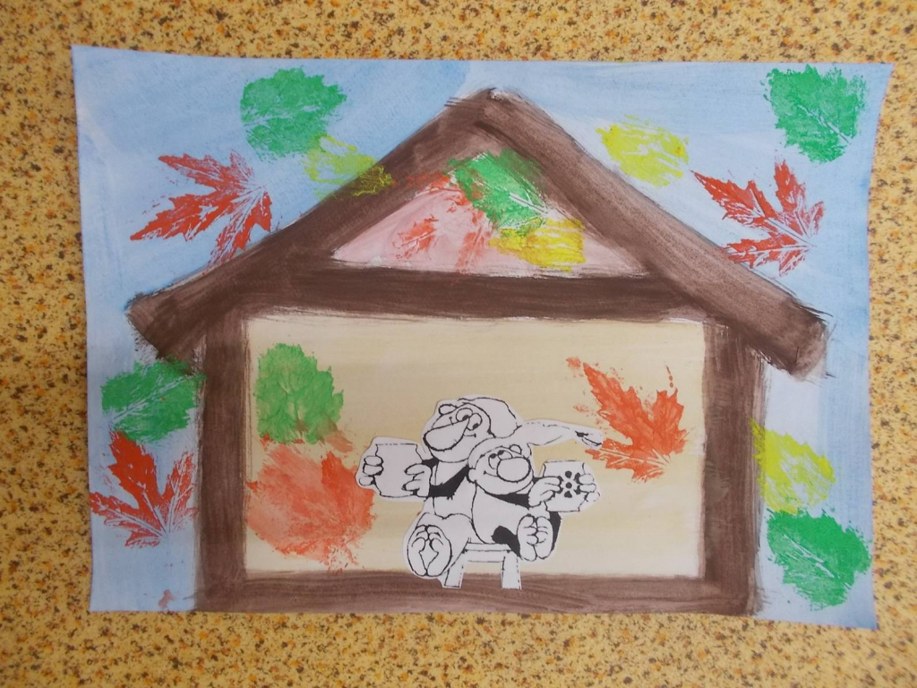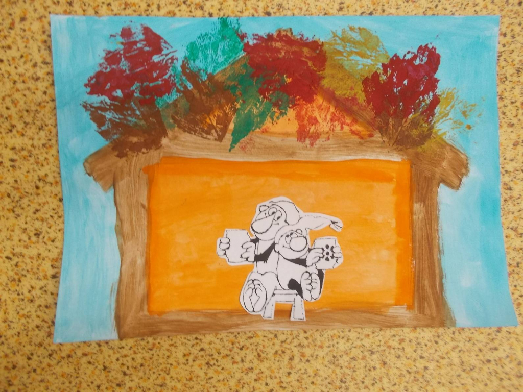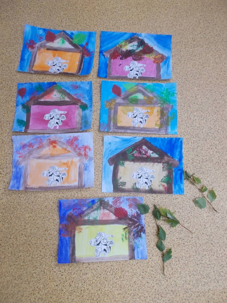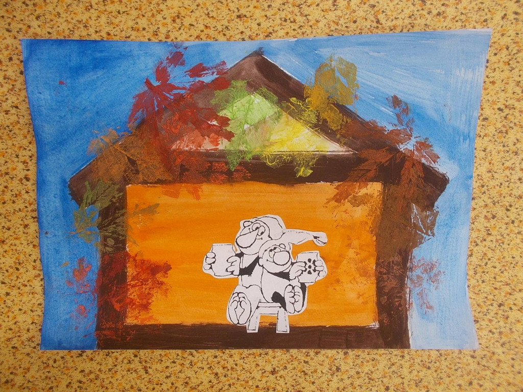 Kdo by neznal Křemílka a Vochomůrku! Jejich obydlí si žáci namalovali tak, aby mohli nahlížet do jejich skromného příbytku. Chaloupka všem připomíná, že je podzim. Celou si ji děti zasypaly listy. Vznikaly jako otisky skutečných listů temperovými barvami.