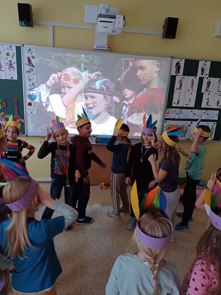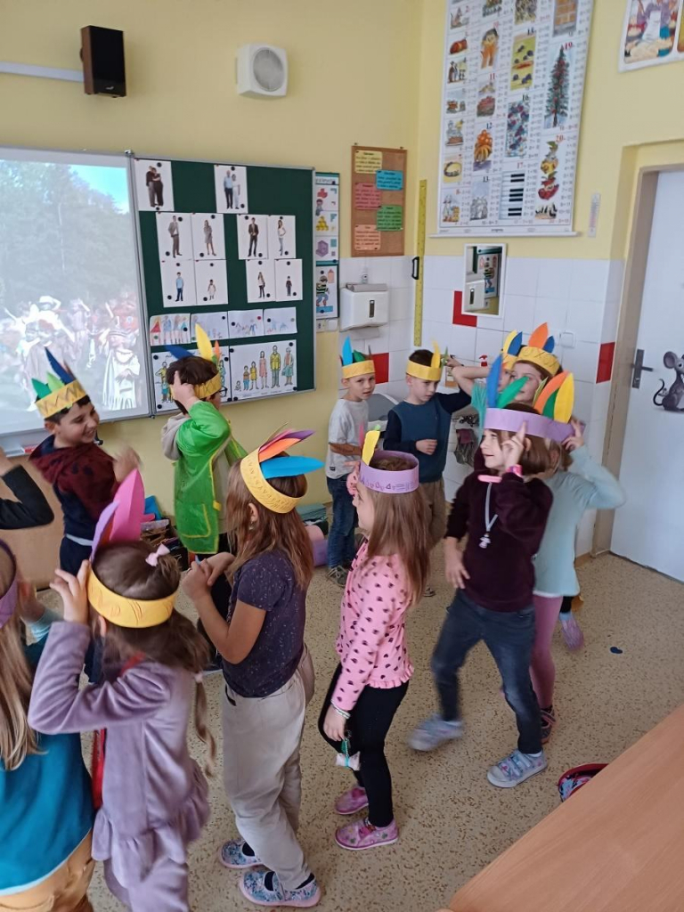 Děti se dnes seznámily s písmenem I. Motivací při vyvození hlásky a písmene I byl výlet k indiánům. V hodině praktických činností si žáci vyrobili indiánskou čelenku a zatančili si při písni Malí indiáni Míši Růžičkové.