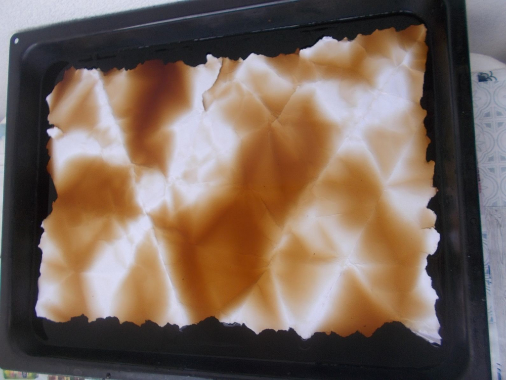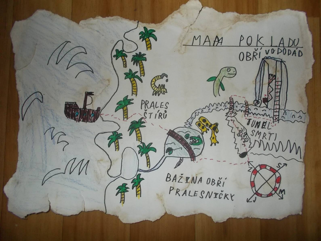 V dalších hodinách jsme navázali na tuto tematiku kresbou mapy pokladu. Ráno byl ve třídě plech plný horkého čaje a slabé kávy. Z bezpečnostních důvodů jsem ho přenesla mimo prostor třídy. Děti byly zvědavé, k čemu bude sloužit. Měl nám zajistit starobylý nádech map. Nejprve si všichni užili nezvyklé mačkaní papíru, otrhávání okrajů. Teprve poté se mapy namáčely do připravené čajové lázně. Do usušeného podkladu se mohlo kreslit až v dalším týdnu. Žáci popustili uzdu fantazie a snažili se do cesty hledačům pokladu vložit různá překvapení.