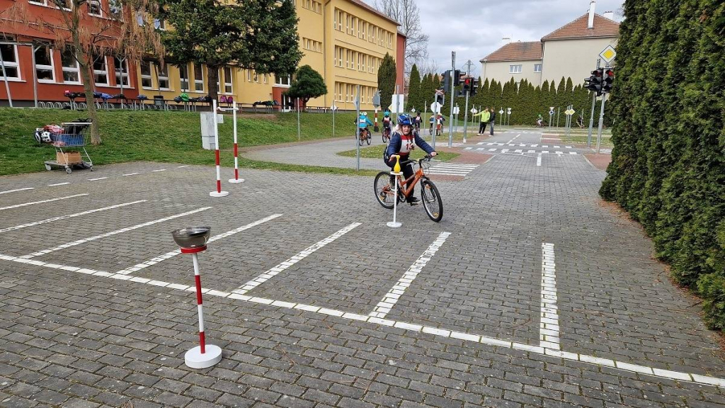 S panem instruktorem jsme si znovu zopakovali pravidla, která by měl znát dobrý cyklista – výbavu kola, dopravní značky, kde mohu jezdit, jak bezpečně odbočovat, sestupovat z kola, … Asi nejtěžší bylo řešení dopravních situací na křižovatkách, což se ukázalo také při psaní testů. Většině žáků se i přes velkou trému testy podařily, a tak jsme mohli jít ven, prokázat své znalosti také při jízdě po dopravním hřišti.