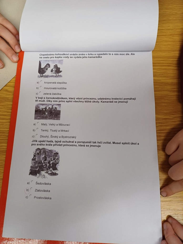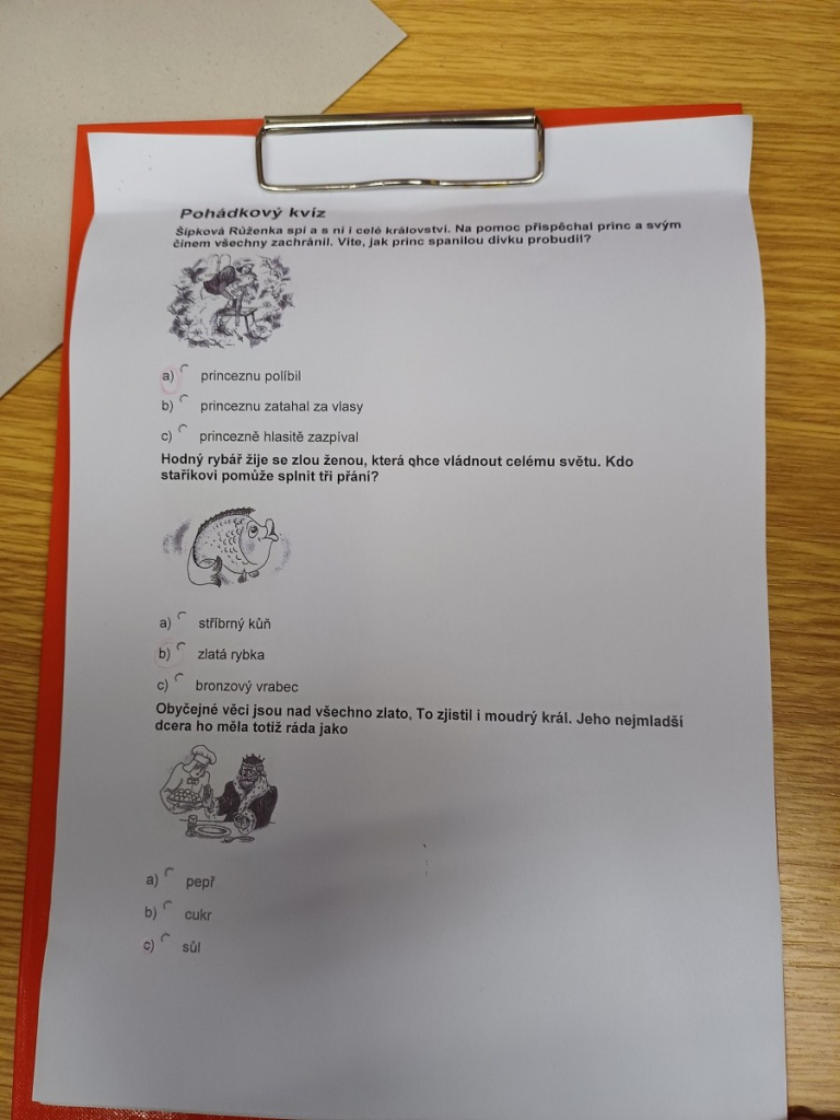 V závěru programu děti opět ve skupinách luštily pohádkový kvíz. Při kontrole ukázaly, že ty nejznámější pohádky znají. Kromě čtení si procvičily také týmovou spolupráci.