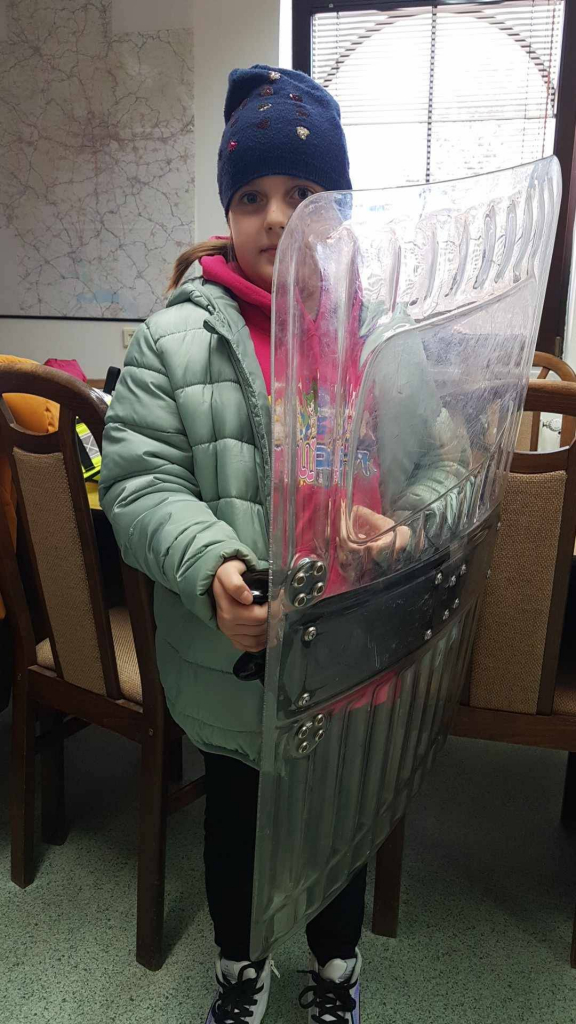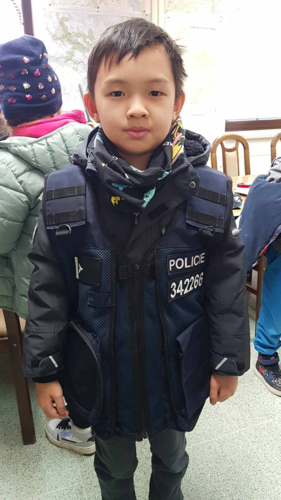 Děti si také vyzkoušely policejní oblečení, včetně vest, čepic a pout. Bylo úžasné vidět jejich nadšení, když se oblékly do balistické vesty, nasazovaly si čepice, držely štíty a cítily se jako opravdoví policisté. Na závěr návštěvy předala Dianka policistům obrázek, který jim na památku za naši třídu namalovala.