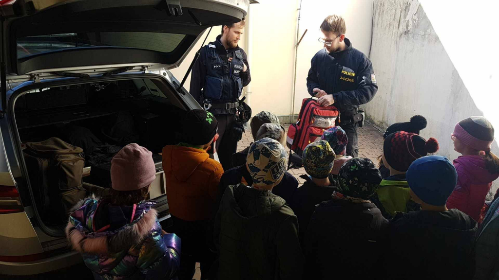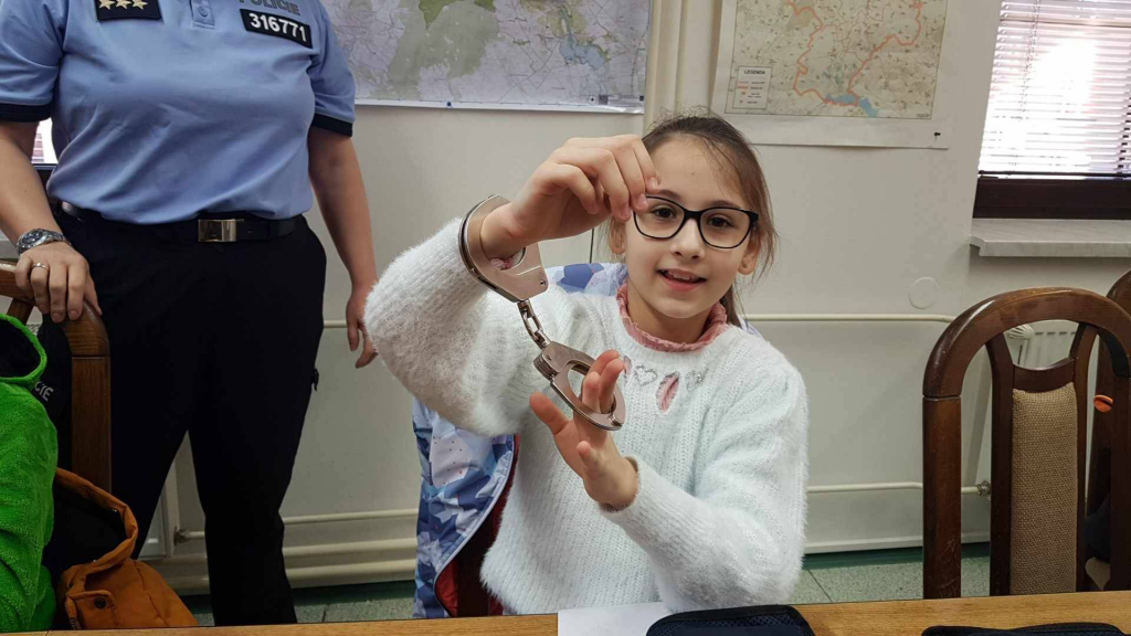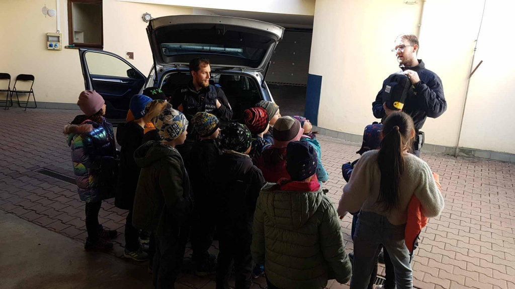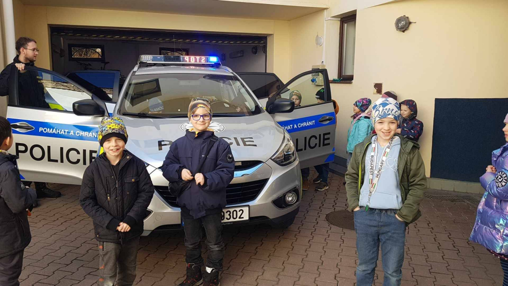 První zastávkou byla cela, kde si děti mohly vyzkoušet, jaké to je být uvnitř. Následně jsme se přesunuli k policejnímu vozu, do kterého se mohly děti posadit a prohlédnout si jeho výbavu. Policista jim ochotně ukázal všechny důležité součásti vybavení a vysvětlil jejich funkce.