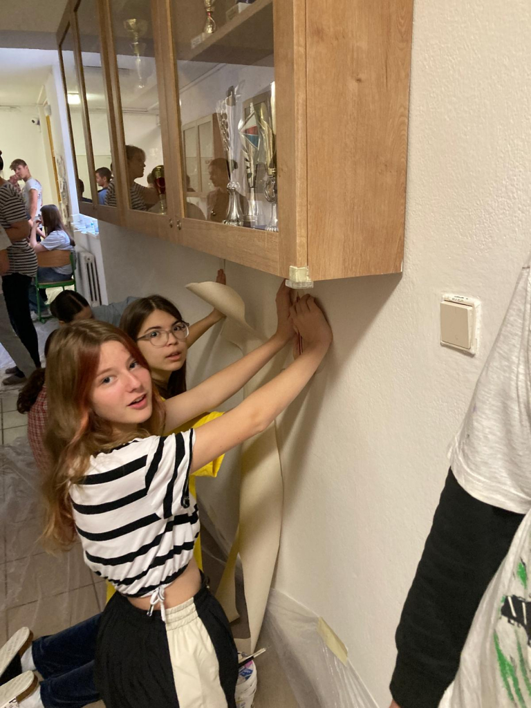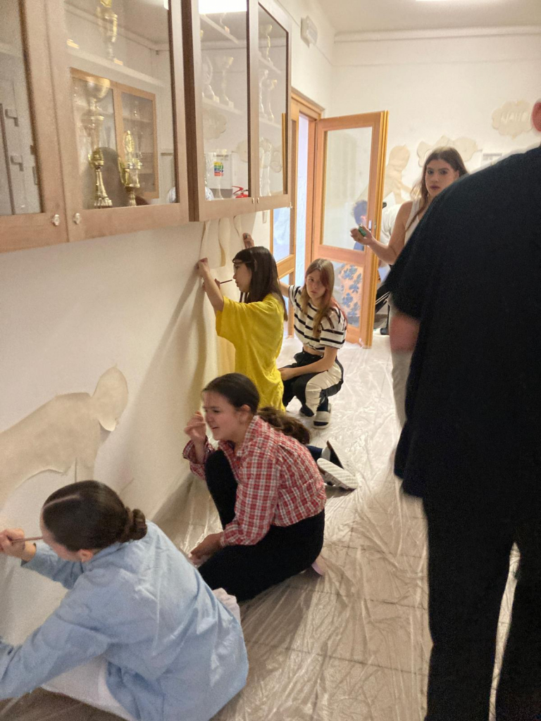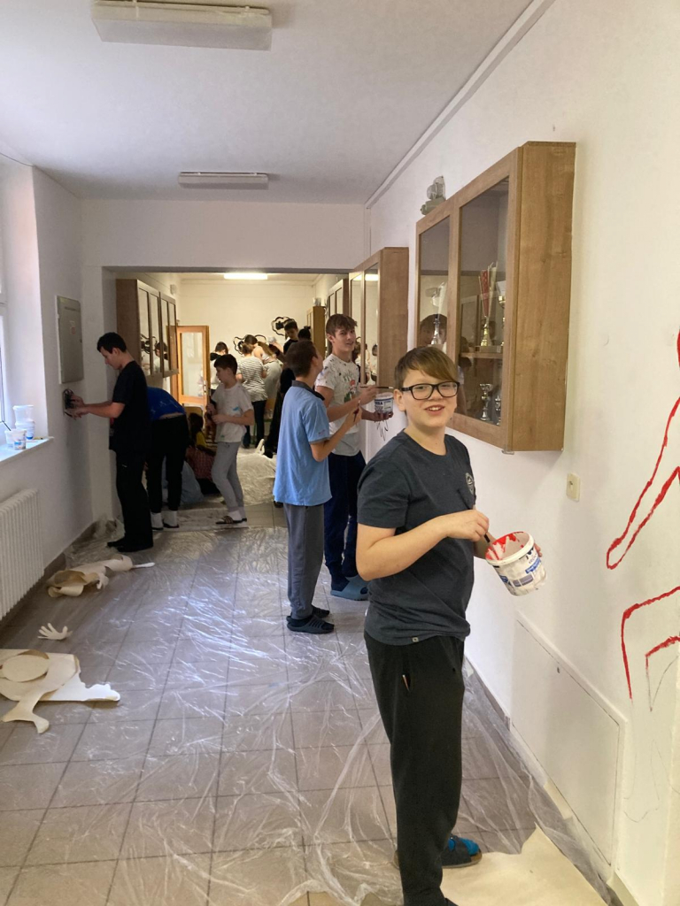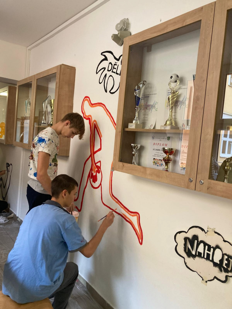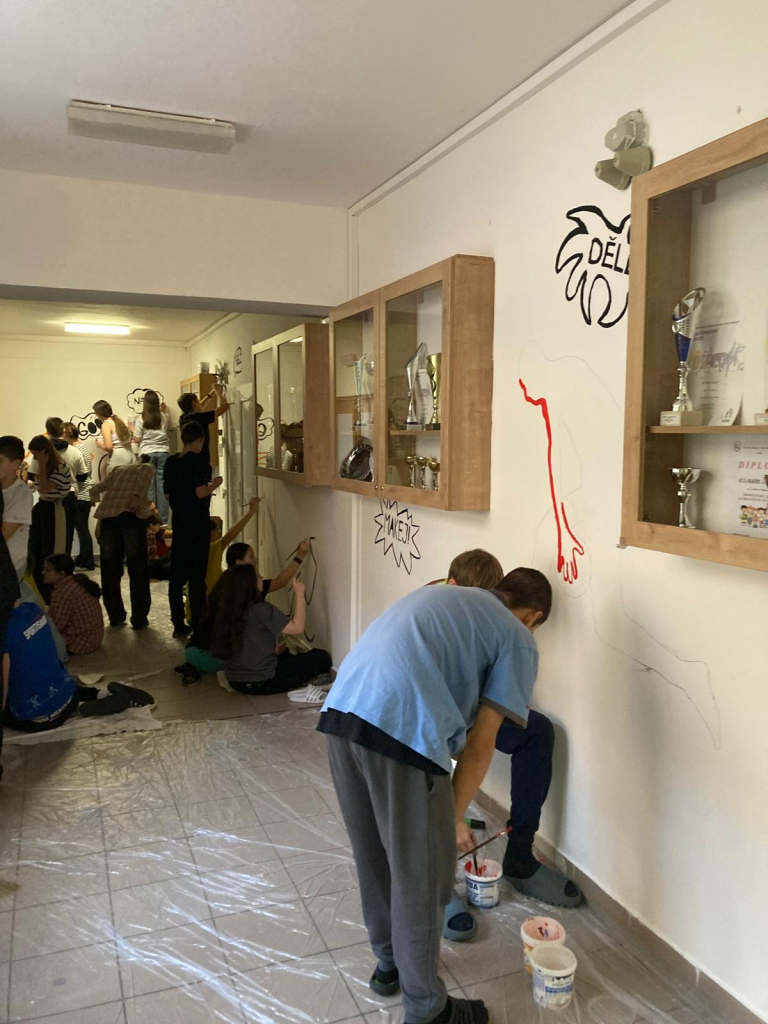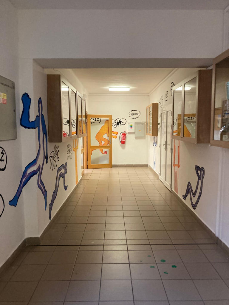 Tentokrát jsme si vzali do parády prostor chodby před tělocvičnou: stěny chodeb pokryly další postavy, nyní se ale jednalo o postavy v pohybu, doplněné o sportovní pokřiky.