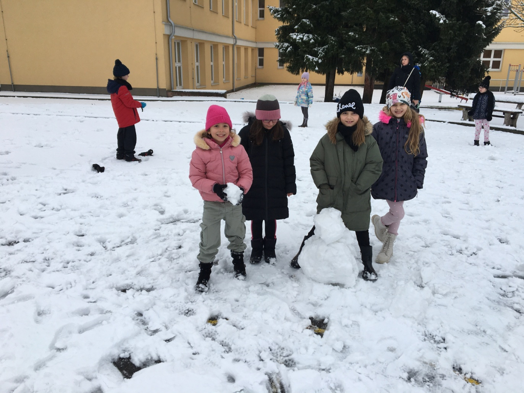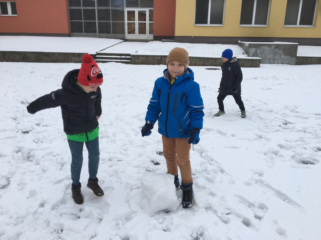 Dnes taky napadl čerstvý sníh. Všichni byli netrpěliví a chtěli stavět sněhuláky, a tak jsme vyrazili ven. Některé děti se pustily do stavění sněhuláků, jiní začali tvořit koule a začala pořádná koulovačka. Sníh létal vzduchem. Všichni jsme si užívali tu pravou zimní radost. Když jsme se vraceli zpět do družiny, byli jsme spokojeni a z oken sledovali naše výtvory.