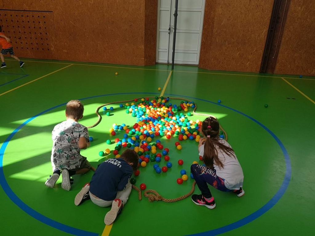 Ve tělocviku si děti zahrály zábavnou hru, představovaly si, že jsou kuřátka a slepice, a snažily se vyhnout lišce, která na ně číhala. Na lžičkách opatrně přenášely vajíčka, aby jim nespadla. Poté se zaměřily na třídění vajíček podle barev do správných hnízd. Byla to skvělá hra na rozvoj obratnosti a týmové spolupráce.